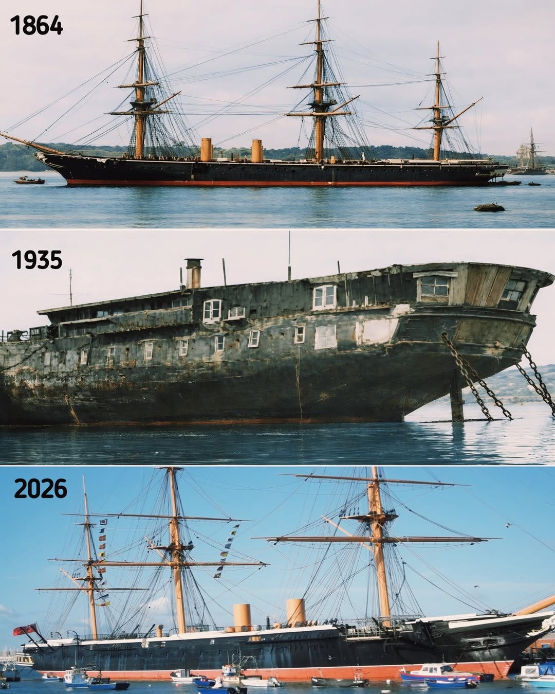 “As naval technology advanced quickly, newer warships soon surpassed Warrior, and by 1871 she was withdrawn from frontline service and later used in coastguard and training roles. In 1904 she became part of the torpedo training establishment at Portsmouth, renamed Vernon III, and eventually was reduced to a floating jetty at an oil depot in Wales, where she remained for decades. Recognition of her historic importance led to a major preservation effort beginning in the late twentieth century. After extensive restoration at Hartlepool, the ship was towed back to Portsmouth in 1987 and placed at the Historic Dockyard, where she remains preserved today as a fully restored museum ship and the last surviving example of the ironclad warships that transformed naval warfare.”